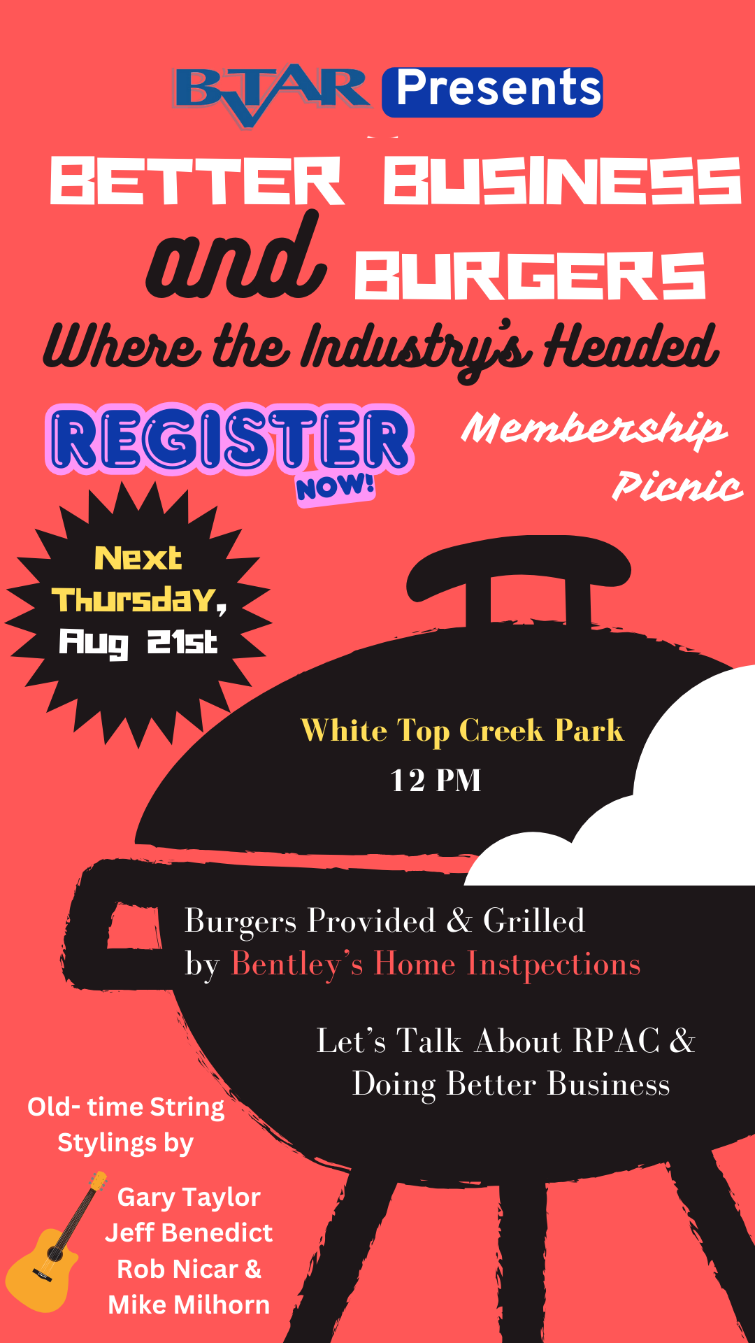 Join us a White Top Creek Park for a delicious picnic lunch of burgers and fixin's with our BTVAR Realtor members and Industry Partners!
